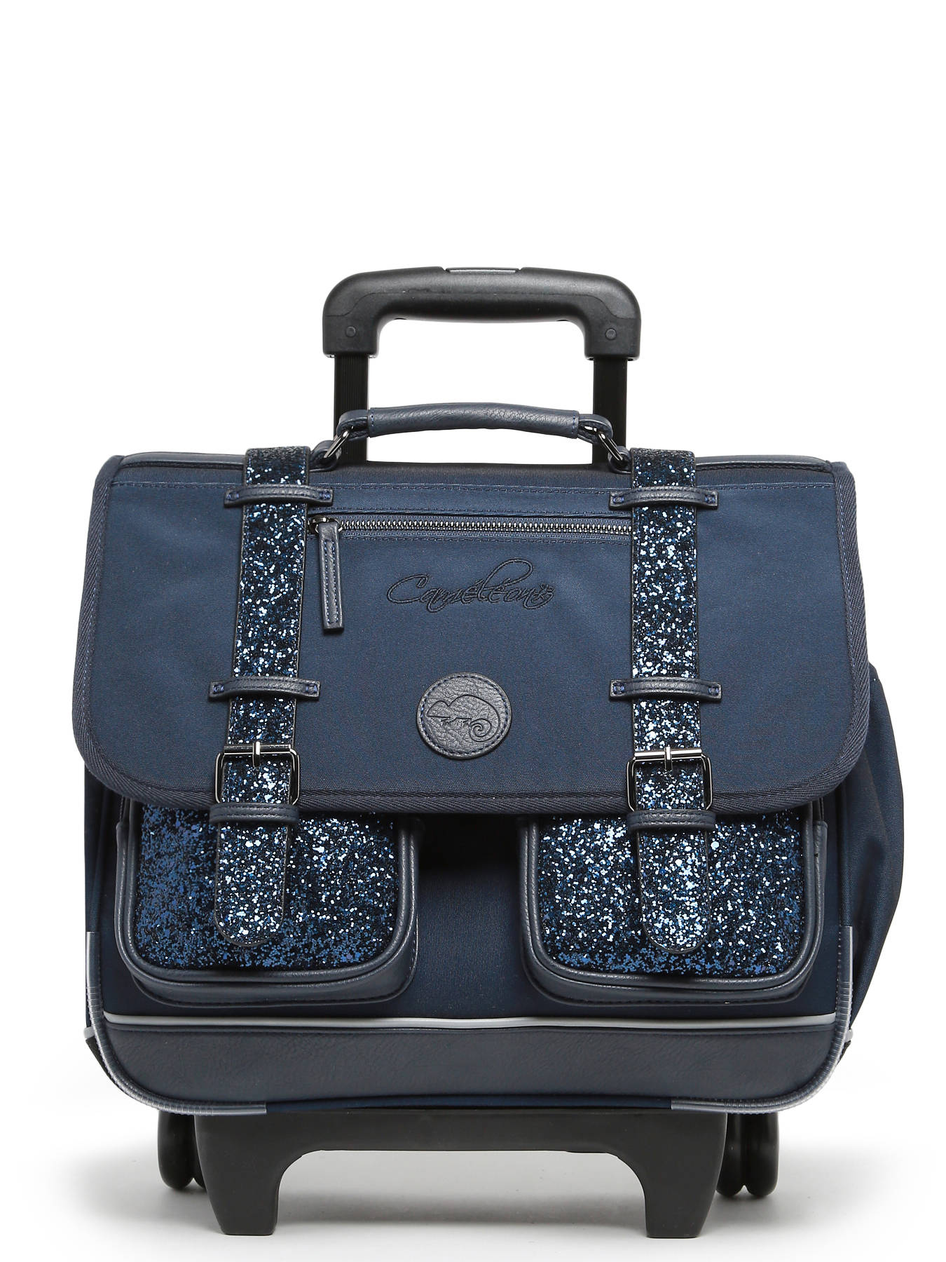 Deze boekentas op wieltjes uit de Vintage Fantasy collectie van het merk Caméléon heeft een breedte van 38 cm. Ideaal voor het 1ste, 2de en 3de leerjaar! Dit model heeft een duidelijke vintage look, dankzij de twee voorvakjes in lederlook en de riempjes met gesp. Deze boekentas beschikt over twee compartimenten, die schriften (24x32 cm) en schoolboeken van A4 formaat kunnen bevatten. Onder de overslagflap bevindt zich ook een uniek opbergvakje, met een gratis liniaal! De twee vakjes vooraan sluiten met rits, en zijn ideaal om een snack of andere kleine spulletjes in te stoppen. Dit model beschikt ook over een naamlabel aan de achterzijde, en kan makkelijk gesloten worden dankzij een dubbel kliksysteem. Voor optimaal comfort zijn de rugzijde en schouderbanden gewatteerd. Dankzij enkele reflectoren kan uw kind zich ook veilig in het verkeer begeven. De schouderriemen dienen te worden opgeborgen in het rugcompartiment bij gebruik van de wieltjes. Een extra flap schermt de wielen af wanneer de tas op de rug wordt gedragen.