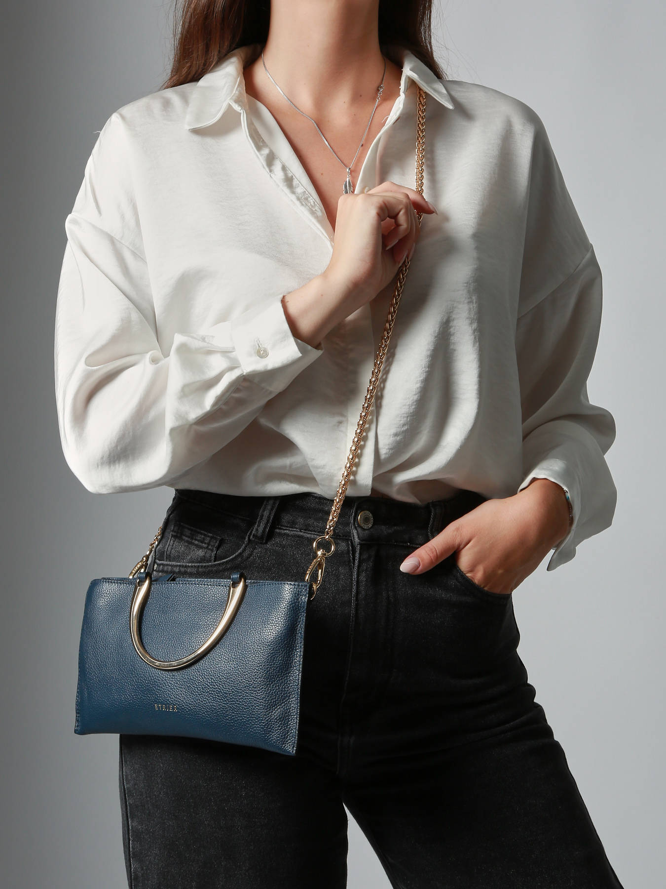 De ETRIER tas uit de TRADITION lijn is verkrijgbaar in verschillende even elegante kleuren. TRADITION is tijdloos met zijn gekorreld leer en vrouwelijke uitstraling. Versierd met een ketting, biedt deze creatie zowel een handtas als een schoudertas.